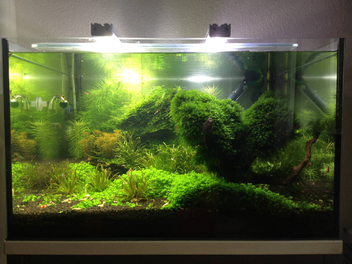 Leider sieht man auf dem Vergleichsbild keinen großen Unterschied, da die Handykamera die Belichtung ändert, um nicht nur grelles Licht auf dem Foto zu haben! Auf dem letzten Bild kann man es aber ganz gut erahnen! Lichtfarbe ist Daylight, sehr natürlich und verdammt hell! Eine ganz neue Welt, auch für die Garnelen und Pflanzen. Nach einer knappen Stunde Licht an ist das Wasser Sauerstoff-gesättigt und alles sprudelt drauf los. Die Mosuras bekommen helleres und dichteres Weiß, einfach herrlich. Jetzt wird das Becken aufgeräumt und umgestaltet und dann sitz ich nur noch davor und gucke! :D