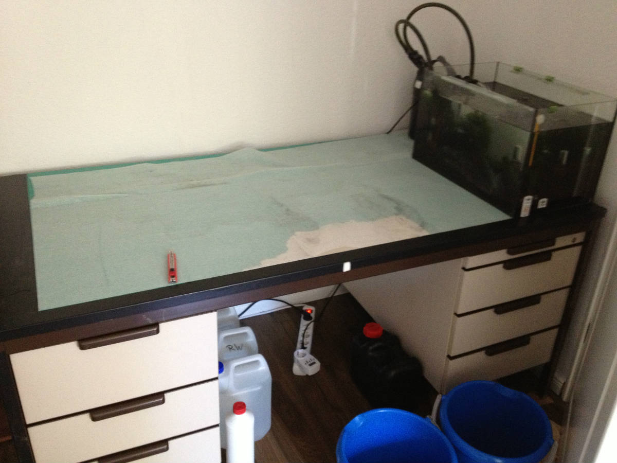 Das besagte Regal kam am Freitag mit der Post und am Samstag war der Umzug geplant. Also 5 Becken abbauen, das Wasser zwischen speichern, Schreibtisch auseinander bauen und raus tragen, Regal aufbauen und reintragen, Becken drauf, Filter neu verschlauchen, Wasser rein und Lampe drüber.