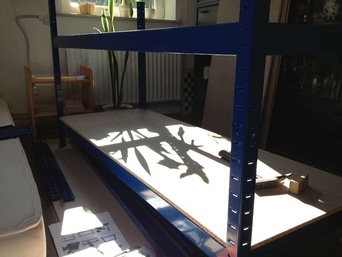 es gab viel zu tun am Wochenende und dies möchte ich euch nun hier dokumentieren. Meine 5 50l-Becken stehen ja nun seit einem dreiviertel Jahr auf einem alten Büroschreibtisch, der mir bis dato sehr stabil vorkam. Als ich letzte Woche jedoch etwas genauer hinsah, konnte ich erkennen, dass sich die Tischplatte in der Mitte ein wenig durchbog (evtl. 0,5cm). ALARMSIGNAL! Ich träumte diese Nacht von Überschwemmung im Haus und toten Bienen auf dem Laminat und entschied mich daher, ein Schwerlastregal zu kaufen, dass seinen Namen verdient und ich wieder beruhigt schlafen kann.