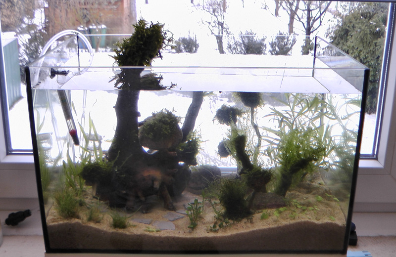 Diese beiden Becken sind ein Experiment. Ich will versuchen, ob ich EX1 möglichst algenfrei halten kann und EX2 soll gerne schön veralgen. Das Fenster hat reichlich direkte Sonne (wenn sie denn mal scheint). In EX2 sind nur emerse Moose und andere draußen gefundene Pflanzen (bis auf zwei Sumpfschrauben). Außerdem ist in einer Ecke Teichschlamm und hinter der Schieferterrasse ist Maulwurferde. Beides leicht mit Sand bedeckt.
