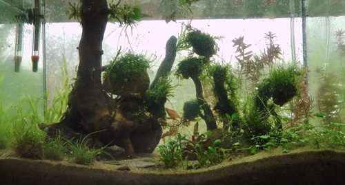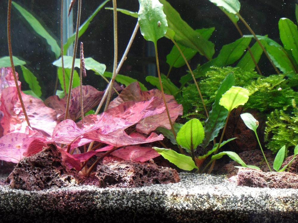 Gefiltert wird mit einem Luftfilter betrieben über eine Eheim AirPump 200. CO2 bekommt das ganze über das Plant Growth System von Tropica. Den Heizstab haben wir nur für die Wintermonate, damit es nicht allzu kühl wird in dem Becken. Da wir mittags ganz schön Sonne auf dem Fenster haben, haben wir an die Rückwand eine schwarze Schaumstoffmatte gestellt, damit es ein wenig schattiert wird. Es kommt zwar immer noch Sonne ins Becken, aber nicht mehr so prall wie vorher. Nun haben wir bei Sonnenschein immer diese wunder wunder schönen Lichtreflexe im Becken. Die hätte ich auch gerne in unserem größeren Becken :D