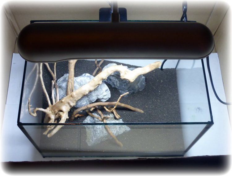 Neben einem Nanobecken, welches eigentlich meiner Tochter gehört, für dass ich aber die volle Verantwortung habe (meine Tochter wird sechs), und einem Aquascape-Becken, dass noch in Planung ist (64-128 Liter - mal sehen...), habe ich seit Kurzem noch ein (fast)technikloses 12 Liter Miniscape auf meinem Schreibtisch im Büro stehen, damit ich auch dort nicht auf den schönen Anblick eine Unterwasserlandschaft verzichten muss...