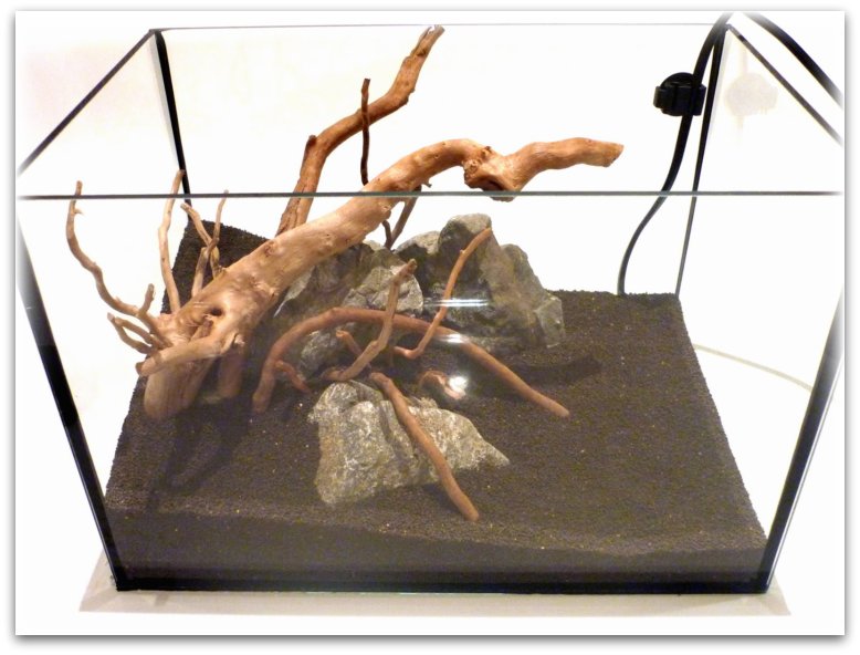 )Das Hardscape beschränkt sich auf einige rote Moorkienwurzelstücken und drei Manten Stones.