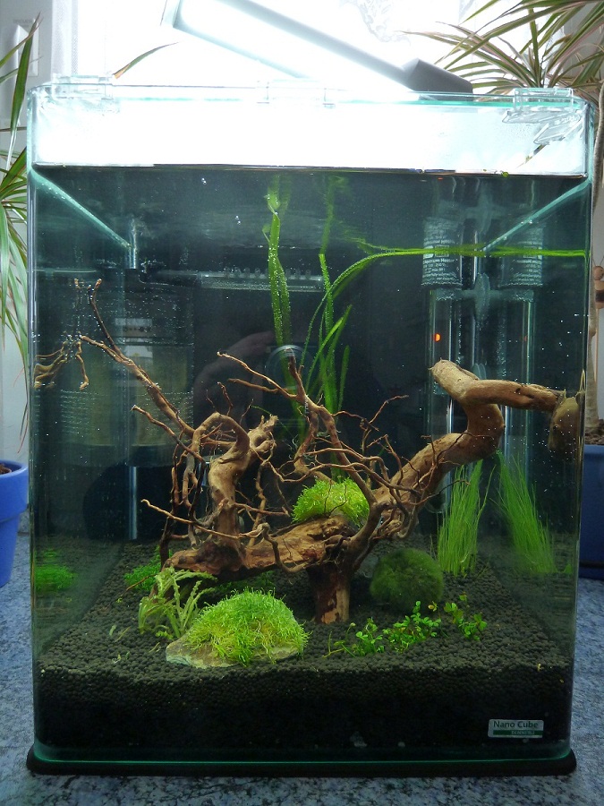 Hier möchte ich Euch meinen neuen Cube vorstellen. Den hatte ich eigentlich schon eingerichtet und da sollten Red Fire einziehen. Dann hab ich aber ein 54 Liter Becken gekauft und die ganze Planung umgeschmissen. Den Cube "platt gemacht" und eben grad wieder eingerichtet. Als Bodengrund hab ich Soil, von Fluval Stratum. Wasser ist Osmosewasser mit Bienensalz aufgehärtet. Die Wurzel ist eine Wüstenwurzel. Auf die hab ich mit einem Haarnetz Teichlebermoos aufgebunden. Vorne auf dem Stein auch. Ich hab das noch nie gemacht und hoffe das es so anwächst. Hinten hab ich ein Tausendblatt, sieht man wahrscheinlich nicht. Einen Ableger von meiner Valisnerie, dann noch so ein Gras, da weiß ich den Namen nicht. Und vorne ist noch Zwergkleeblatt. Ich hoffe diese kleinen Pflänzchen sind morgen immer noch da wo ich sie hingepflanzt hab und treiben nicht auf der Wasseroberfläche. Achja, das Helferli hab ich noch vergessen aber ob das was wird weiß ich nicht.