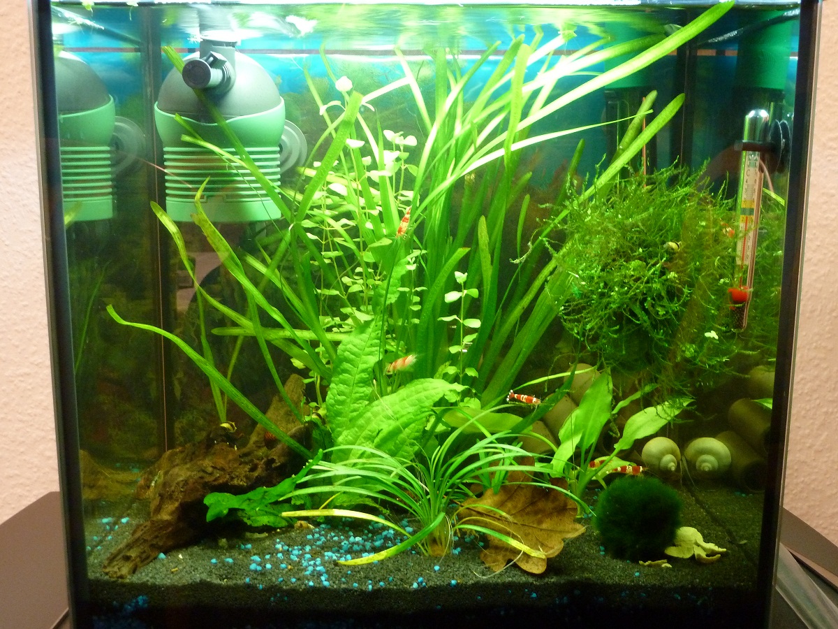 Es ist ein Tetra Aqua Art mit 30 Litern. Im Becken sind rot-weiße und schwarz-weiße Bienengarnelen. Ferner 2 Rennschnecken, eine Apfelschnecke in blau, Turmdeckelschnecken und zu meinem Leidwesen eine Blasenschneckenplage.