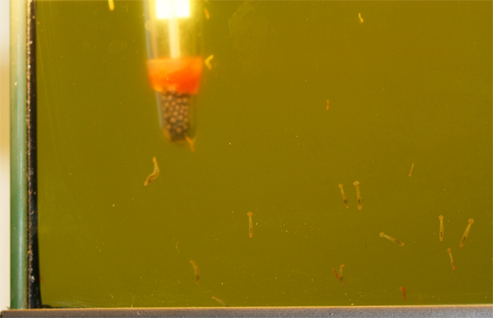 Am Anfang driften die Larven eher wirr durch das Aquarium, immer dem Licht nach. Haben sie einen schönen Knick in der Mitte dann fressen sie. Je älter sie werden, desto mehr orientieren sie sich am Boden und fressen dort den Belag ab.