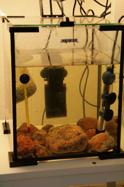 Wieder ein 20l Becken mit Abdeckung, Beleuchtung und Heizer. Ein kleiner Innenfilter ist auch erforderlich; er darf aber nicht zu stark sein. Dieses Becken füllen wir mit Wechselwasser aus dem Elternbecken und schmeissen ein paar Schnecken rein. Auf den Boden kommen Kiesel (Grösse: Golfball -Tennisball). In eine Ecke in die Nähe des Filterausflusses hängen wir einen Beutel mit Zeolith. Dann lassen wir es einlaufen. Die Molukkenbabies sind am Anfang noch viel zu klein um sie ins Strömungsbecken zu den Eltern zu setzen (Vom Winde verweht - Effekt). Besonders um die Fütterung einfach zu gestalten und die Übersicht zu behalten sollte man ein kleines Aquarium als Babybecken nehmen. Ein 20l Cube z.B. ist ideal.