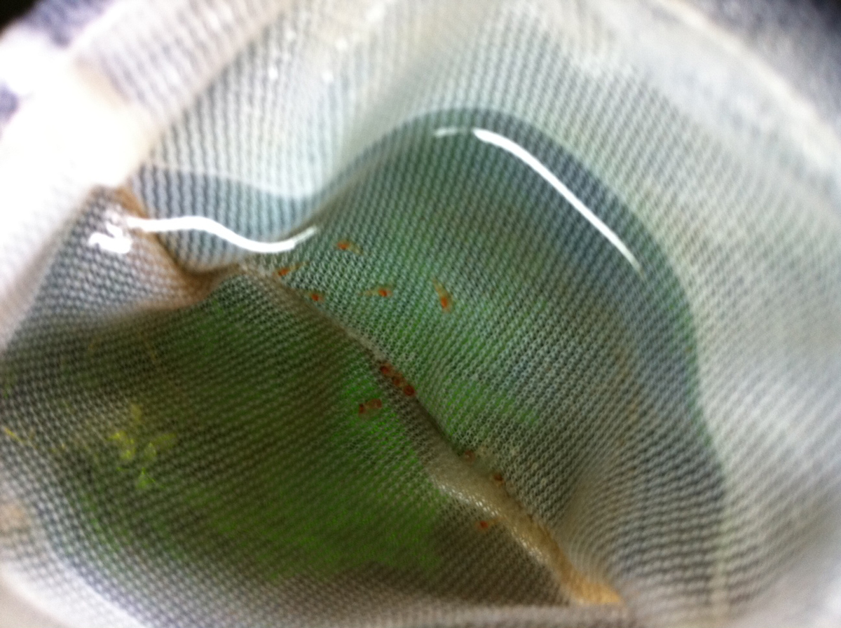 Nach dem Schlupf der ersten 6 Garnelen ging nix mehr, es kamen zwar noch kleine Garnelchen aus den Eiern, waren auch schon als fertige Tiere zu erkennen, blieben aber reglos im Kescher liegen.