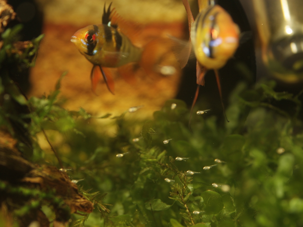 Vor kurzem hat sich ein Paar rauskristallisiert und obwohl die noch recht klein waren haben sie schon viermal gelaicht, aber auch das Gelege gefressen ... dachte ich bis heute abend. Entweder ich habe etwas übersehen oder sie haben etwas übersehen. Auf jeden Fall standen sie an der Scheibe wie immer auf Futter wartend umgeben von irgendwas. Erst dachte ich an Muschelkrebse, dann an Wasserflöhe und kam gar nicht auf die eigentlich naheliegendste Idee. Da schwammen doch tatsächlich so 20-30 kleine Buntbarsche umher! Man sind die winzig - konnte mich schon gar nicht mehr daran erinnern. Die Bosmiden die ich sofort reingeworfen habe schienen mir zu groß, aber die Artemia brauchen erstmal mindestens einen Tag bis ich da was von abziehen kann. Mal gucken ob ich noch auf die schnelle irgendetwas anderes aktivieren kann.