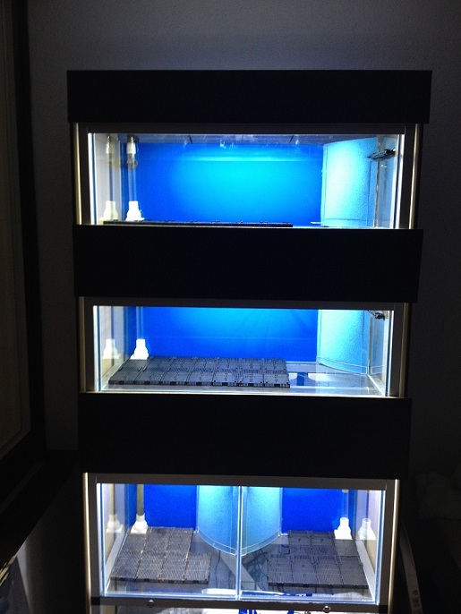 Das System besteht aus einen Zentralfilterbecken ( 75 x 35 x 25 cm ) , 2 Weißglasbecken a (75L x 35T x 25H ) und 1 Weißglasbecken ( 75l x 35 H x 35 T ).