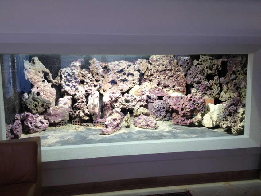Hier schonmal ein kleiner Vorgeschmack. Das Becken wurde früher als Meerwasserbecken betrieben. Die rund 1.5 Tonnen jugoslawisches Lochgestein werden demnächst mit einem Kran durch eine Dachluke im obersten Stockwerk eines mehrstöckigen Hauses rausgehoben. Gleichzeitig kommen dann etwa 2.5 Tonnen Quarzsand rein. Das wird bestimmt eine spannende Aktion :)