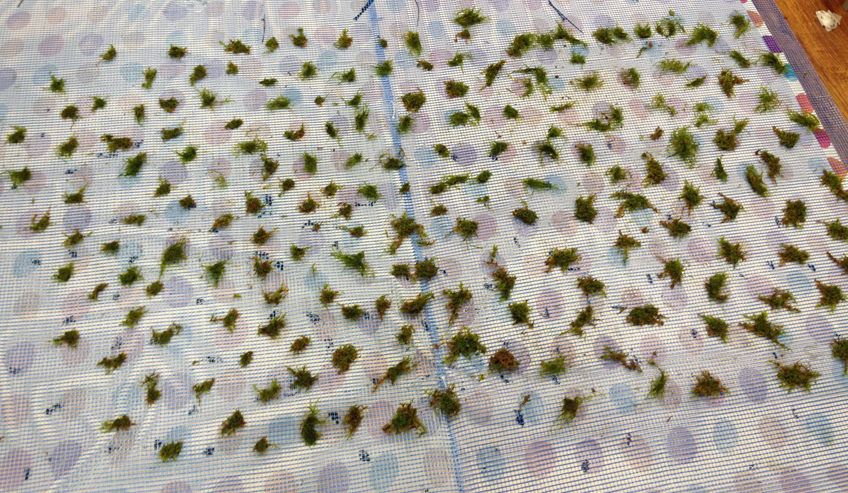 Das Problem, wie ich die Mooswände befestige, konnte ich nun lösen. Ich werde sie oben aus dem Wasser ziehen und am Beckenrand im Trockenen befestigen. Unten werden sie in den Sand eingebuddelt.
