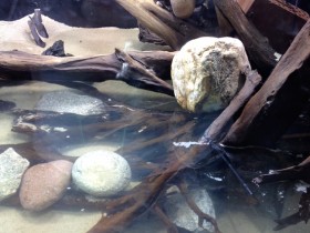 Ich war bei meinem 600er Becken immer wieder erstaunt, warum soviele leere TDS-Häuser auf dem Sand lagen. Bis ich dann des Rätsels Lösung beobachten konnte. Die Denisonii Barben scheinen das Fleisch sehr zu mögen und vergreifen sich auch hin und wieder an den Schnecken. Schnecken absammel ist gut machbar bei diesem Becken. Oben drauf ist ein Wagen, auf den man sich setzen kann und so übers ganze Becken fahren kann. Sonst häng ich hin und wieder ein paar Gemüsestücke rein und fang sie so raus. Wir haben dort weitere Becken, unteranderem mit Kugelfischen. Aber soweit ich weiss, schaffen diese es nicht, die harten Häuser der TDS zu knacken. Aber Verwendung für Schnecken haben wir in jedem Fall.