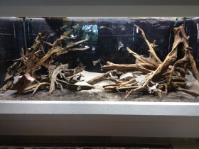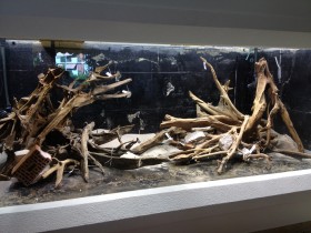 Das Hardscape steht und etwa 1/4 Sand ist nun auch im Becken. Morgen gehts weiter...Wir haben die Holzteile, beidenen es möglich war, direkt am Boden befestigt. Morgen wird beschwert und dann Wasser eingefüllt, damit sie anfangen können "auszubluten" und zu wässern. Danach kommt Purigen in die Filter und am kommenden Freitag werden die Pflanzen geliefert.