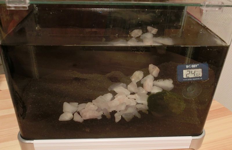 nun da ihr mir sehr bei den Vorbereitungen geholfen habt, möchte ich auch mal meinen ersten Versuch dokumentieren. Viel ist noch nicht geschehen. Heute habe ich das Becken gefüllt. Es fasst ca. 12 Liter. Ich habe schwarzen Kies als Bodengrund. Ist allerdings ein bißchen viel geworden. Drauf habe ich als Deko Rosenquarz und zwei Mooskugeln. Eine davon will noch nicht untergehen.