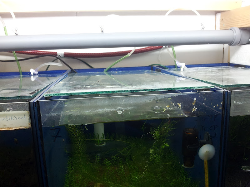 Folgendes: Ich schneide für jedes Becken einen ca. 20cm breiten und 100cm langen Streifen aus Plexiglas, der hinten genau da Aussparungen bekommt (Dremel läßt grüßen), wo die Luftheber sind. Dieser Steifen wird dann also komplett über die hintere Hälfte des Beckens gelegt. Extra Halterungen braucht es hier nicht, weil das Plexiglas durch die mehrfache Unterteilung der Becken genug Auflagefläche hat.