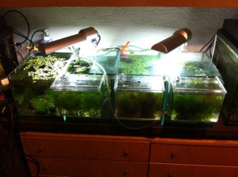 Ich hab bei mir 4 12l Becken nebeneinander stehen. Bis jetzt habe ich sie über 4 luftbetriebene Schwammfilter gefiltert. Das will ich aber ändern, da das im Schlafzimmer einfach nervt.