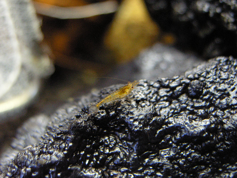 Ob es sich bei meinen Tieren jetzt um die gleiche Art handelt, wird sich zeigen müssen. Die Garnelen sind jetzt 2 Wochen im Becken und sind nach wie vor sehr schön gelb bis orange. Das Beste aber: beim Wasserwechsel hatte ich plötzlich was Lüttes im Eimer ... :happy: ... eines der tragenden Weibchen hatte also entlassen. Die Babys sind mit etwa 3-4mm recht groß und mit bloßem Auge betrachtet gelb.