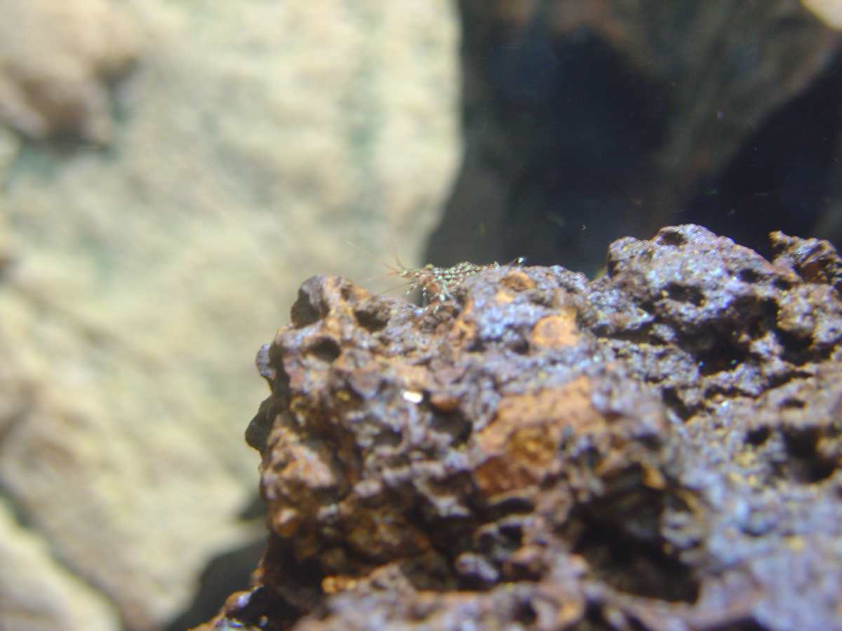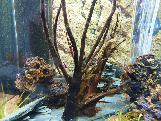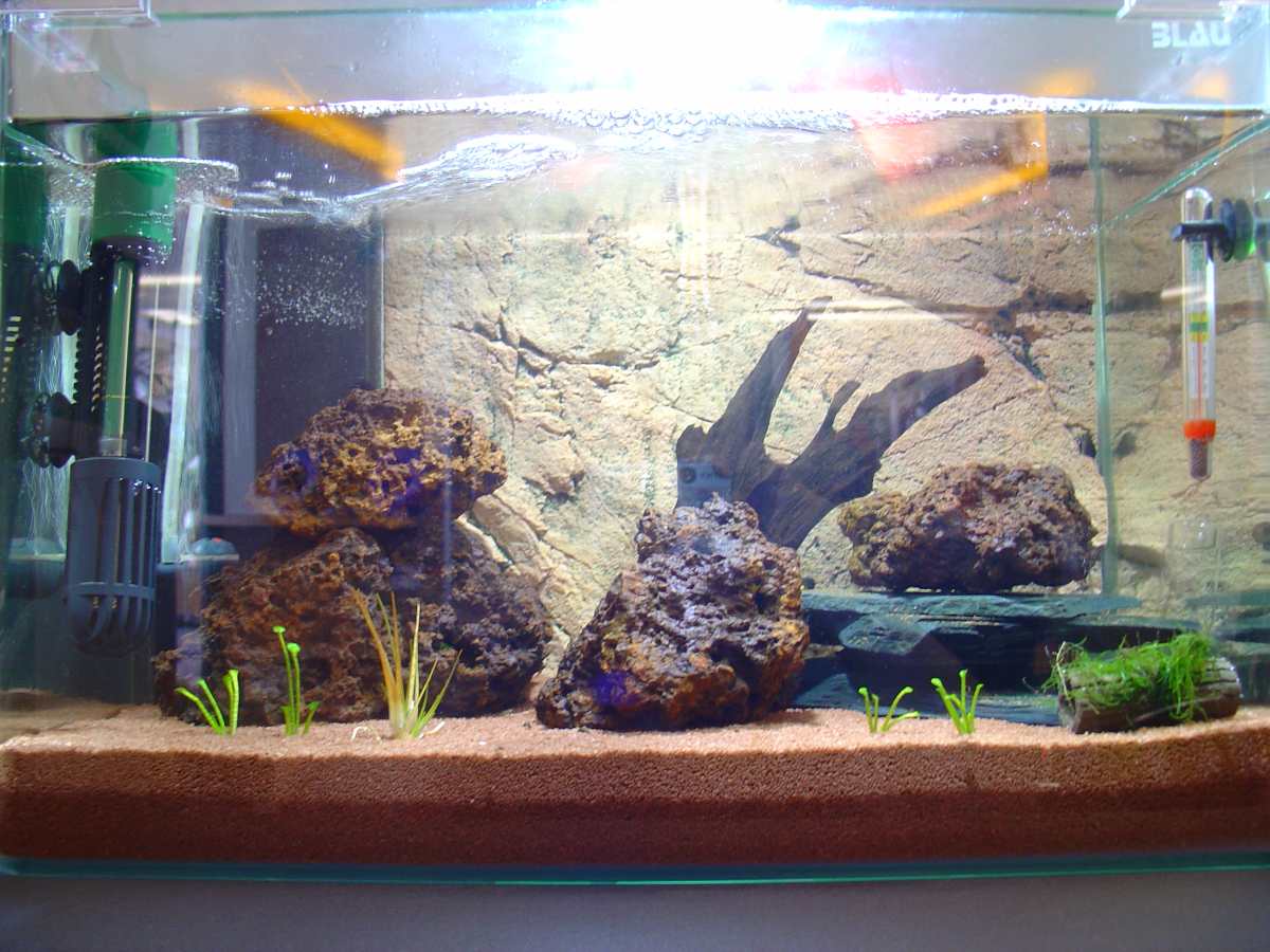 Ich habe eine Slim-Line Rückwand eingeklebt, Kies ist der Dennerle Garnelenkies Borneo braun, der HMF ist von aqua-mac, extra für den 30er Cube passend. Als Pumpe hab ich eine JBL Pro Silent A300, die hat 2 Anschlüsse, an den 2. hab ich einen Sprudelstein angeschlossen. Einen Oxydator hab ich auch reingestellt. Dann sind halt Steine drin, wie die Löchrigen heißen weiß ich leider nicht, das Andere ist Schiefer, das hab ich so gebastelt und mit Aquariensilikon geklebt.