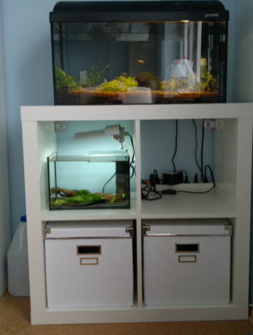Habe zwei Expedits nebeneinander und darauf zur Verstärkung ein Brett, darauf wiederum 2 x 30 l Cube ein Edge und einen 60 l Cube. Im Regal darunter einen 10 l Cube - die Hantiererei ist fast unmöglich, dieses Becken läuft noch ohne Besatz .