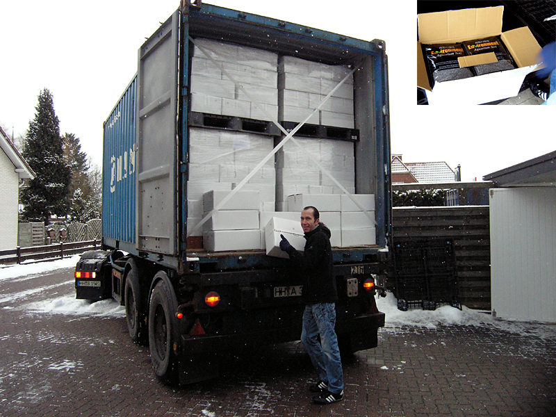 doch, wir haben leider keine große ebenerdige Lagerhalle die man mit Gabelstapler befahren könnte und so muss alles mit Hand abgeladen werden...also denkt daran wenn Ihr einen Beutel kaufen solltet, in jedem steckt echte Garnelenhaus-Muskelkraft drin. :D