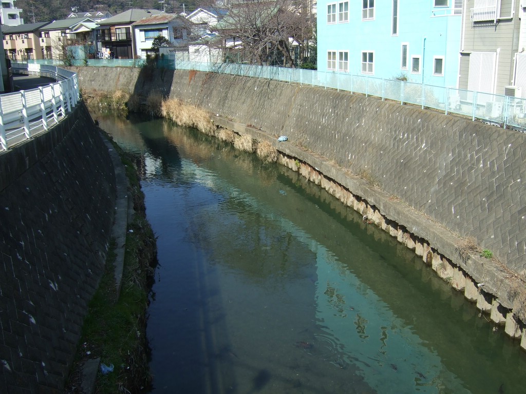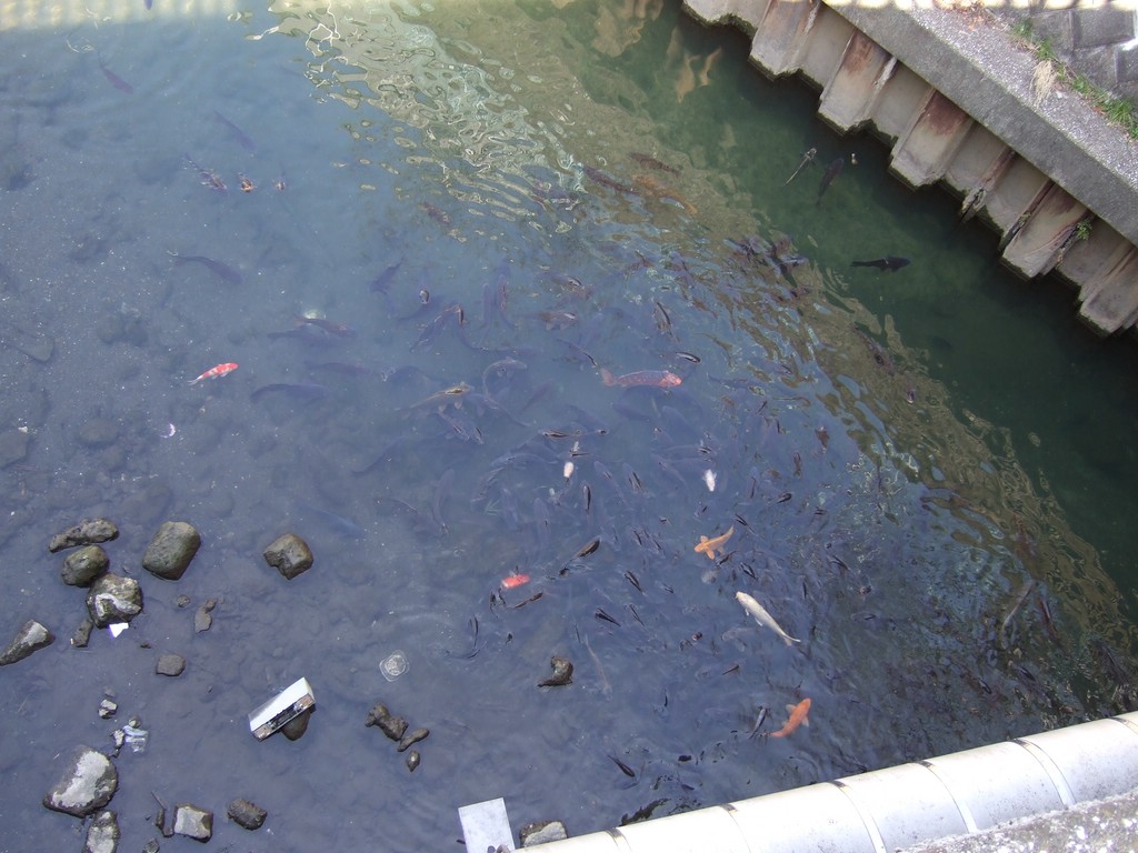 Auf dem Weg vom Bahnhof zu Mr. Yamagishis Laden bot sich mir ein für europäische Augen sehr seltener Anblick. Man überquert dort einen Kanal, die Brücke hat hohe Geländer und sieht „normal“ aus. Als Aquarianer kann man sich ja der Neugier vor Wasser nicht entziehen und so kann man, wenn man wegen des hohen Geländers den Kopf etwas streckt, von oben in den Kanal schauen, der erstaunlich klares Wasser führt und – unerwartet – einen wirklich reichlichen Bestand an Karpfen enthält, darunter auch einige Kois. Dabei fiel mir besonders ein – für mich als Koi-Laie – schön gefärbter Kohaku auf, für den hierzulande sicher ein guter Preis zu zahlen wäre. Aber auch andere Varianten kamen dort vor, wie die nachfolgenden Bilder zeigen.