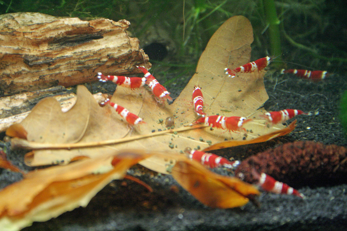 Als ich von der Arbeit kam sah ich an der Scheibe eine Garnelenmama, die in den letzten Wochen tragend war. Jetzt aber ohne Eier. Da ich mir nicht vorstellen konnte, dass sie alle Eier seit heute Morgen verloren hat, habe ich dann mal intensiv ins Becken geschaut und siehe da auf den Blättern und im Moos sind sehr kleine, noch fast durchsichtige Garnelen.