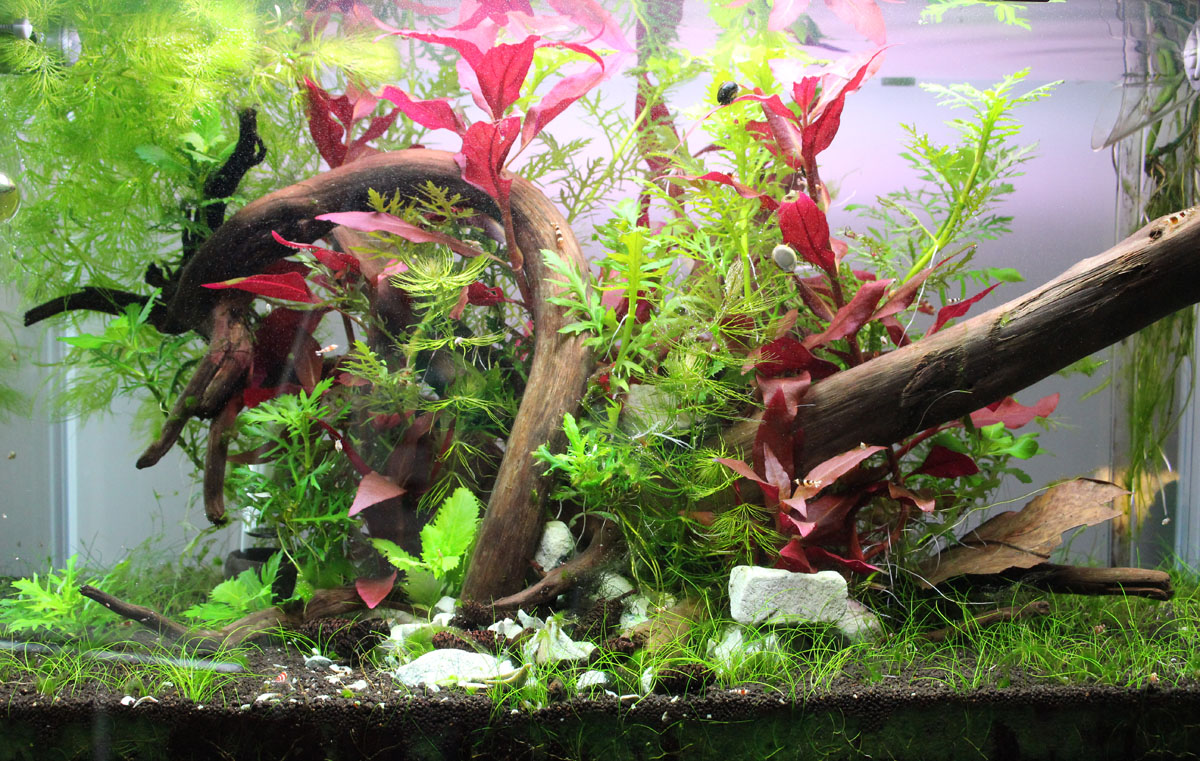 Ich bin grundsätzlich was die stabile Weiterentwicklung und Vermehrung meines Stammes betrifft zufrieden. Auch versuche ich mit gezieltem Düngereinsatz den Scape weiterzuentwickeln. Kurzfristig ist ein Bund Hornkraut im Becken gelandet damit die restlichen Fadenalgen verschwinden.