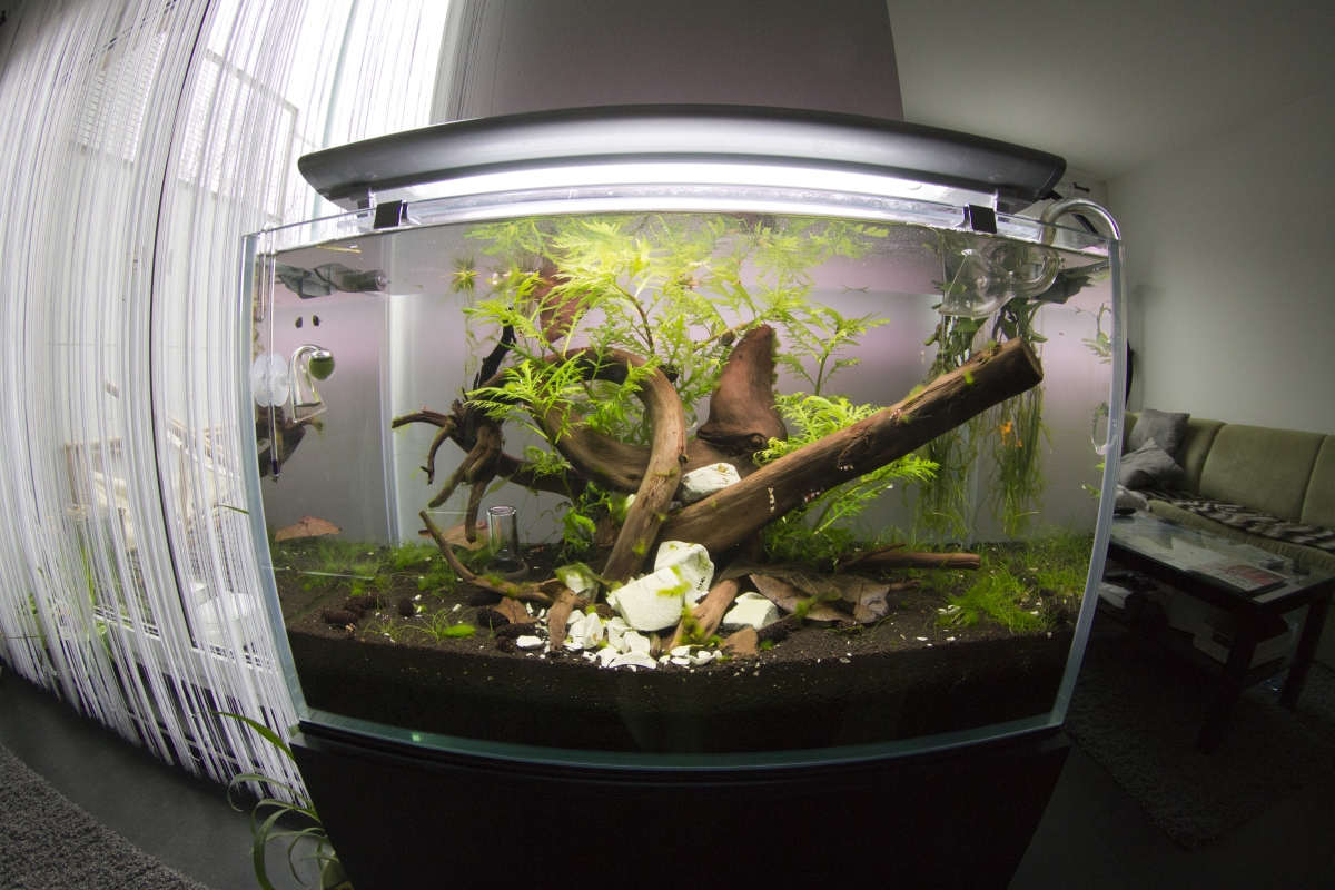 Die Fadenalgen habe im Becken überhand genommen, darum habe ich das Javamoos entfernt und das Layout neu gestaltet. Hoffe es gefällt.