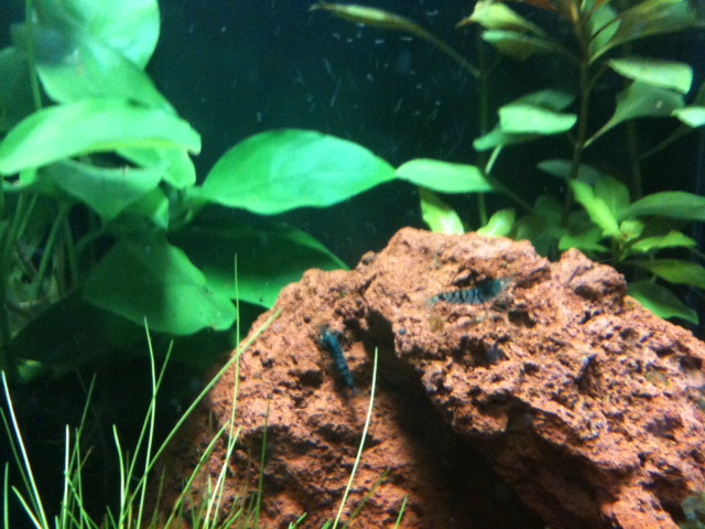 Ich habe immer fleißig Nitrit gemessen und ab und an Nitrat (wobei da der Wert nie richtig hoch war). Als der Nitritpeak dann durch war, sind wir ins Garnelenhaus gefahren. Anfangen wollten wir mit den Orange Eye-Garnelen, weil wir uns schon Sorgen gemacht haben, dass die uns eben mangels Erfahrung eingehen... Frank hat uns dann aber auch ganz tolle Tierchen rausgesucht, von denen 2 eine tolle Blaufärbung hatten, zwei so hellblau waren und zwei eher grünlich, wie die OEs eben so sind. Ich habe auch den Eindruck, dass sie noch nachdunkeln. In ein paar Wochen wollten wir uns dann noch ein paar "richtige" Blue Tigers holen, quasi für den Genpool