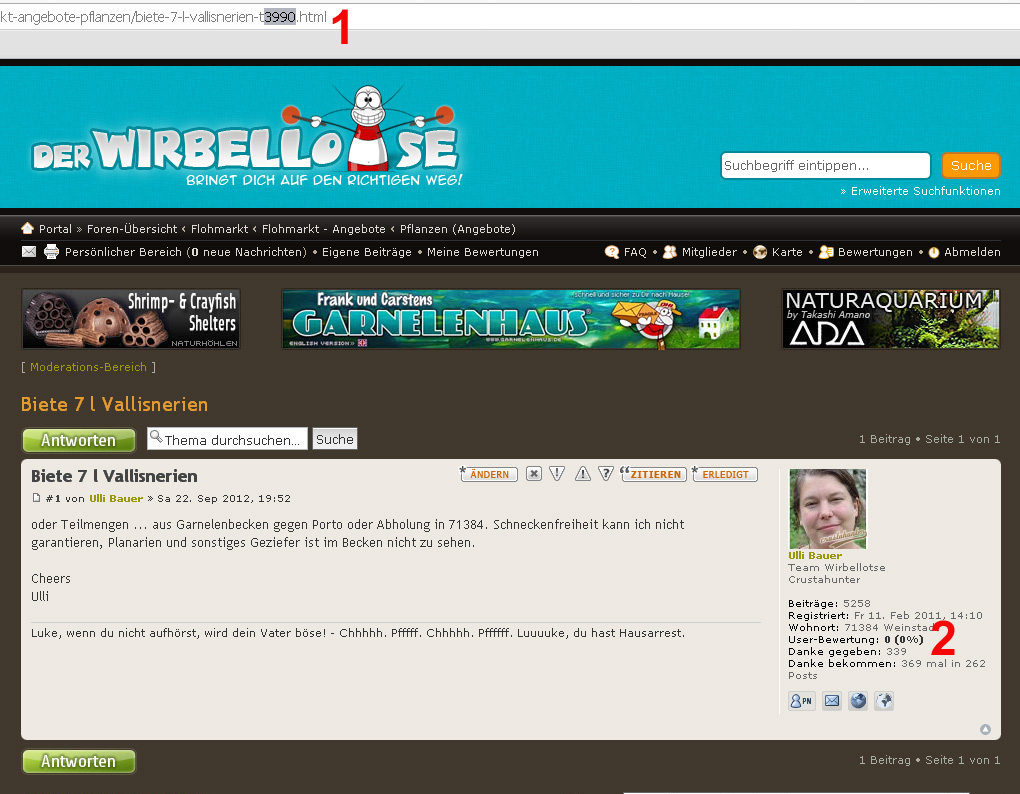 Zuerst die Anzeige aufrufen und oben die Zahl in der Adressleiste hinter dem kleinen "t" kopieren, dann auf die User-Bewertung des Users unter seinem Avatarbild klicken...