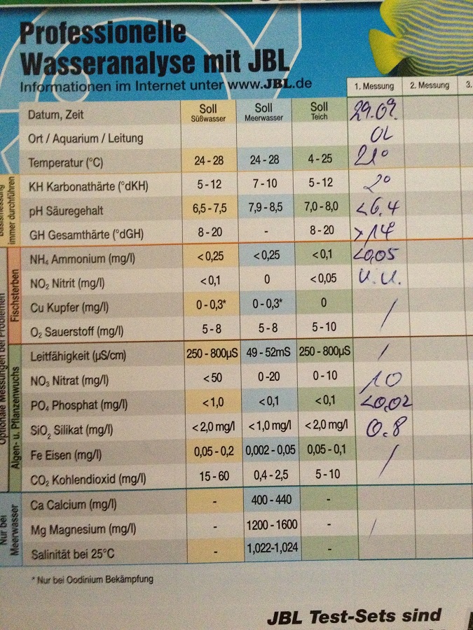 Da ich immernoch mit den Algen kämpfe, war ich eben in einem hoffentlich kompetenzen Zoogeschäft und hab dort mein Wasser testen lassen. Die Werte sind wie auf dem Bild zu sehen: