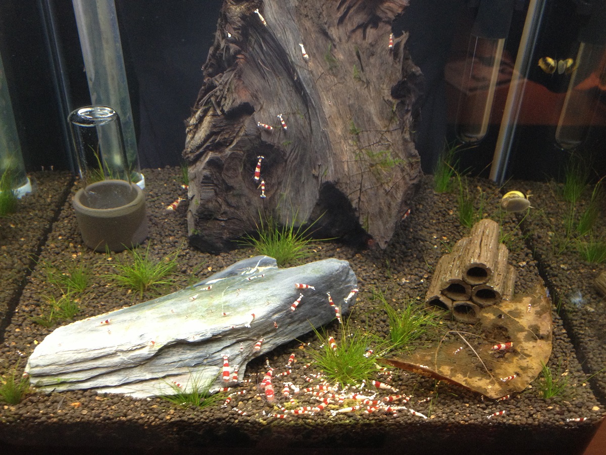 Nun sind zu Weihnachten zwei neue Gruppen eingezogen :D Da sich Blue Bolt meine "Wunschgarnelen" mit den Red Bees kreuzen würden und ich gerne denn noch die blue Farbe haben wollte, mussten 10 "Blue Sakura" Garnelen herhalten ;) Im oberen Teil des Aq ist eher selten bewegung, somit habe ich nach langen überlegen mich für 10 Moskitobärblinge entschieden. Leider sind die Fische bis jetzt noch scheu und halten sich nicht um oberen Teil auf, aber das kann ja noch werden. :)