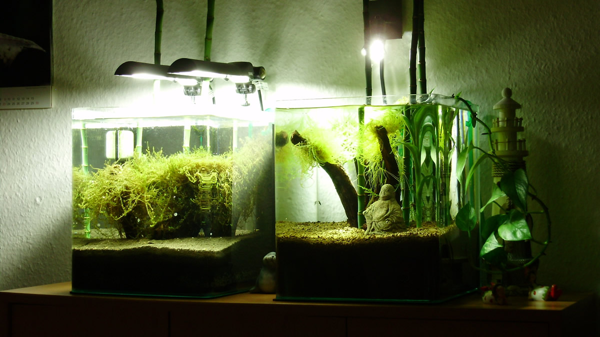 Das Becken ist ein 30er Fluval EBI mit Bodenfilter und ca. 10-12cm EDEN Tropenerde.