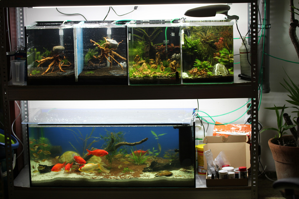 Goldfische, zum anderen wollte ich eine Art Garnelenzentrale haben. Das Regal ist ein