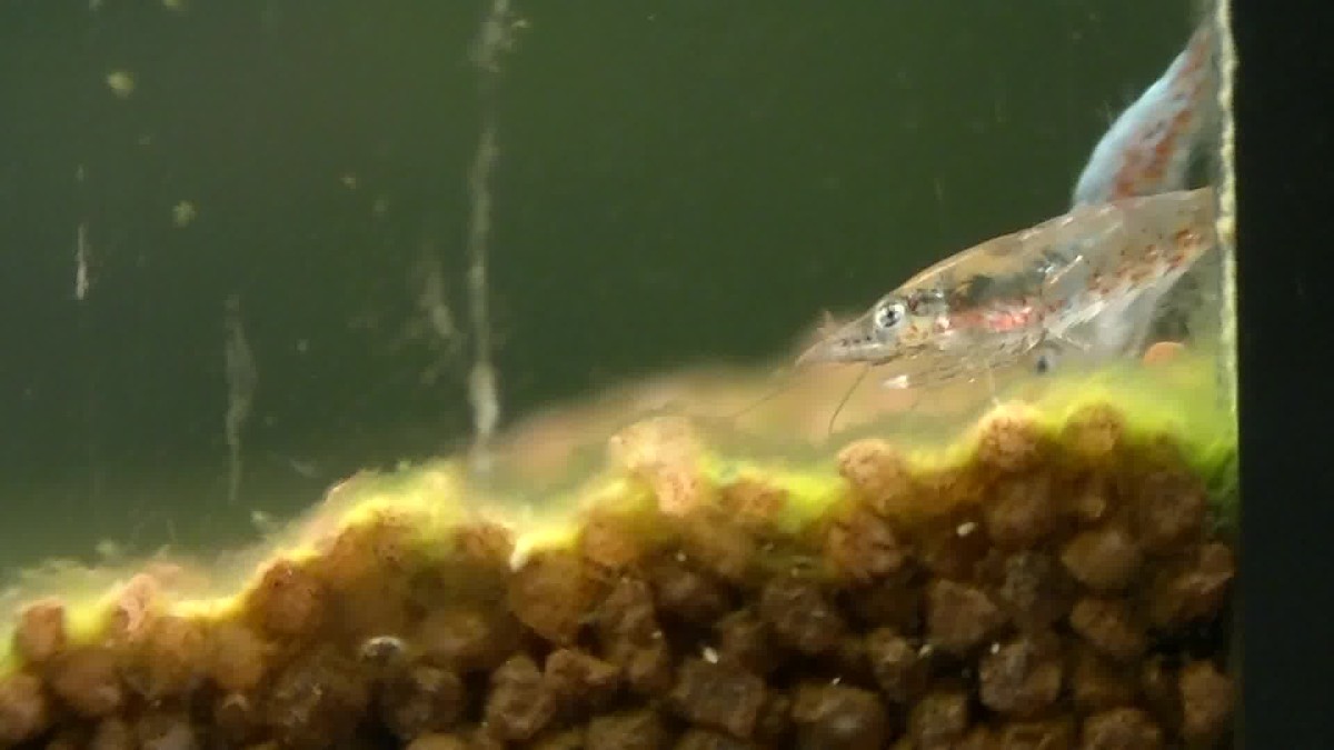 die Kleinen sind jetzt eine Woche im Süßwasser und man sieht schon das sie wachsen, ca. 1,5cm. Leider gibt auch Ausfälle zu berichten :( . Das ist darauf zu resultieren, dass sie sich hinter dem Innenfilter, zwischen Scheibe und Filter, eingequetscht haben. Für kleine Garnelen ist der JBL CristalProfi200 nicht geeignet 8o .