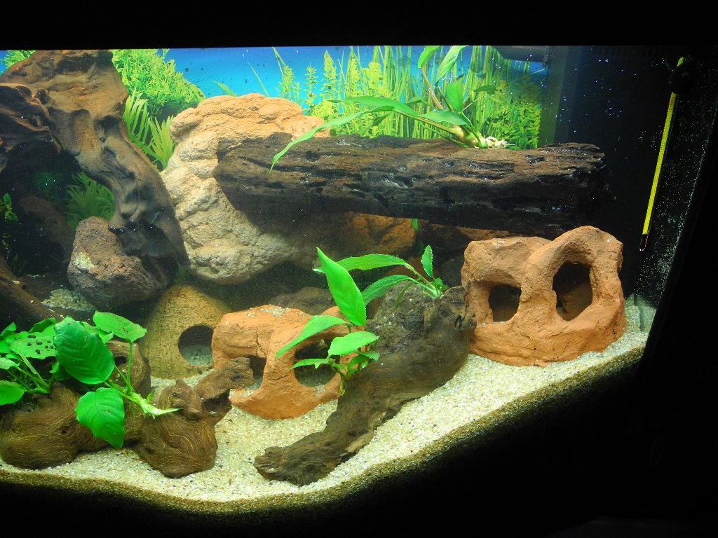 Das Becken ist ein 180er von Juwel mit einem Eckfilter. Naja Naturkies und jede menge Steine und Wurzeln halt zwecks Höhlenbau. Ein paar Pflanzen rein, die nicht von den Tieren angefressen werden und fertig ist es.