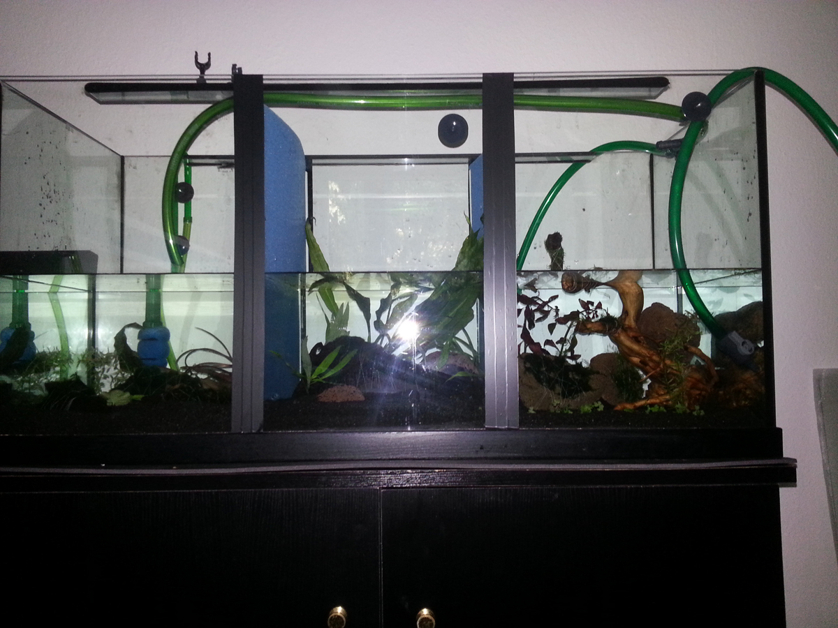 Habe im linken Abteil das Ansaugrohr (natürlich Babygarnelen sicher) und in jedes Becken einen auslauf gelegt. Nur im mittleren Becken kommt durch das T-Stück nicht all zu viel Wasser raus. Muss schauen, dass ich mir noch son Reduzierungsstück kaufe dann fließt dadurch wahrscheinlich auch mehr Wasser(jedenfalls tut es das, wenn man den Schlauch minimal zu hält.