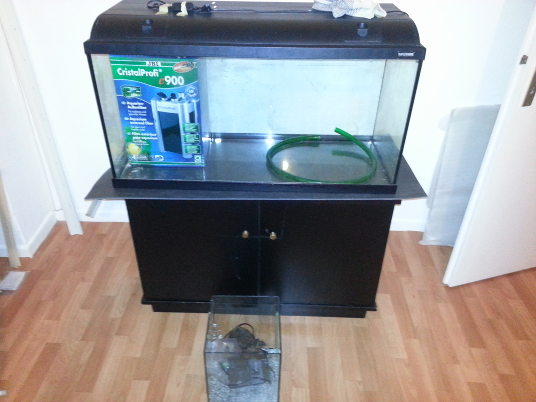 endlich ist es soweit und ich habe mir ein gebrauchtes Aquarium + Unterschrank zugelegt. Leider gab es auf dem Weg Montag zum Verkauf ein Problem. Stande 3:30h (für 5km) im Stau auf der Autobahn und bin anschließen wieder umgekehrt, weil die Autobahn gesperrt war und wir nun auch schon kurz nach 22Uhr hatten. Am nächsten Tag lief dafür alles besser. Die Autobahn war frei und ich bin gut durchgekommen. Zuerst wurde das 200L Juwel Aquarium abgeholt und anschließend wo anderes ein Unterschrank. Als gratis Beigabe zum Unterschrank gab es noch einen kleinen Cube(ca. 15L) inklusive Filter. Der Schrank war für 10€ sowieso fast geschenkt. Der Weg hat sich aufjedenfall gelohnt!