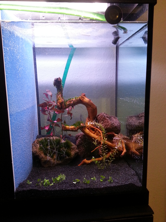 Jetzt gehts auch schonmal an die grundlegende Einrichtung. Eigentlich dachte ich, dass ich viel mehr Platz zur Verfügung habe, aber da das AQ nur 40cm tief ist und 50cm hoch ist das mit dem Platz doch ein wenig enger geworden. Aber seht her was daraus geworden ist. Leider hatte ich nicht mehr soviel Licht und das ganze spiegelt ziemlich: