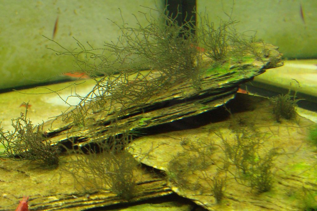 ...bevorzugt wächst sie auf Schiefer und beginnt so ganz langsam in meinem bodenlosen Becken (ohne Bodengrund) auch auf der eingeklebten Hartschaumplatte zu siedeln