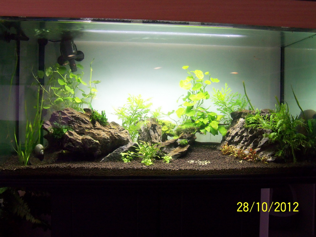 Wir - das sind mein Mann (42), ich (noch 37), unsere kleine Tochter (8 Monate) und drei Stubentiger – haben uns im August dazu entschlossen, wieder eines unserer Becken zu starten. Wir hatten vor unserem Umzug im letzten November unsere drei Becken (56L, 110L und 126L) aufgelöst und wollten erst mal sehen, wie es sich zeitlich nach der Geburt einrichten lässt, wieder neu zu starten … die zwei großen Becken fanden Platz in unserem Wohnzimmer und boten leer allerdings einen irgendwie unbefriedigenden Anblick.
