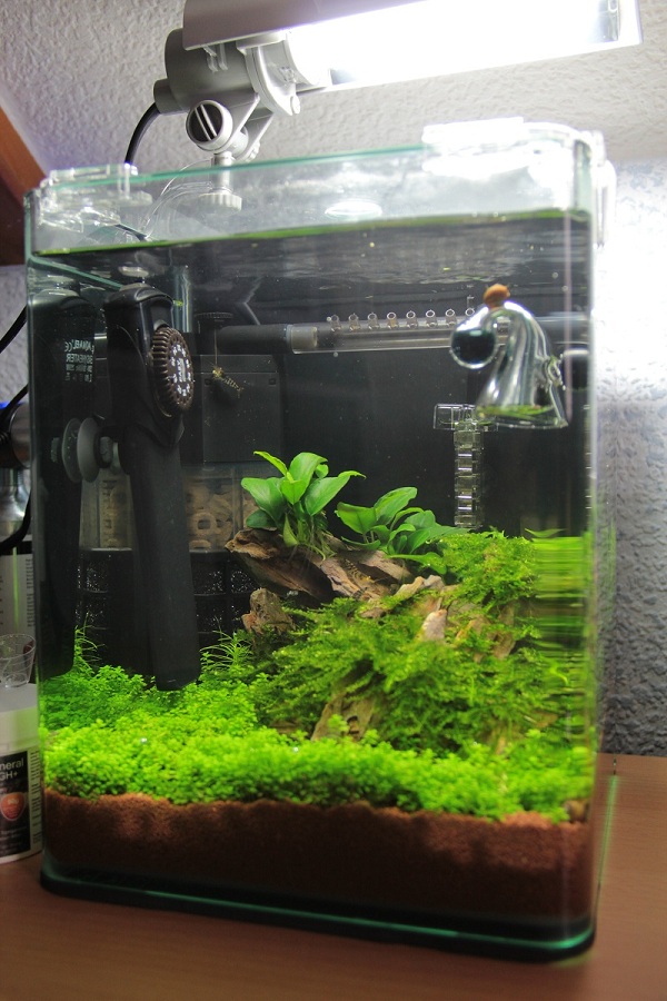 Mit der Aquaristik befasse ich mich jetzt ca seit 2 Jahren, wobei ich erst letztes Jahr mein erstes Becken bekommen habe. Ein Fluval Edge 1. Kurz nachdem ich das Becken zum Laufen bekommen habe, wollte ich sofort ein weiteres Becken haben. Es verging fast ein Jahr, bis ich Zeit und einen Plan hatte( und natürlich meine bessere Hälfte davon überzeugt habe, dass wir noch ein Becken brauchen ;) ). Da ich gerade meine Bachelorthesis schreibe und ich somit viel Zeit am Schreibtisch verbringe, dachte ich mir, ein Schreibtischaquarium wäre doch was tolles. So fiel die Entscheidung sehr schnell auf ein Dennerle 10L Cube.