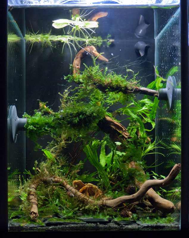 Eingerichtet hauptsächlich mit Moosen, Süßwassertang und Javafarn (das sollte bei der schwachen Beleuchtung gedeihen).