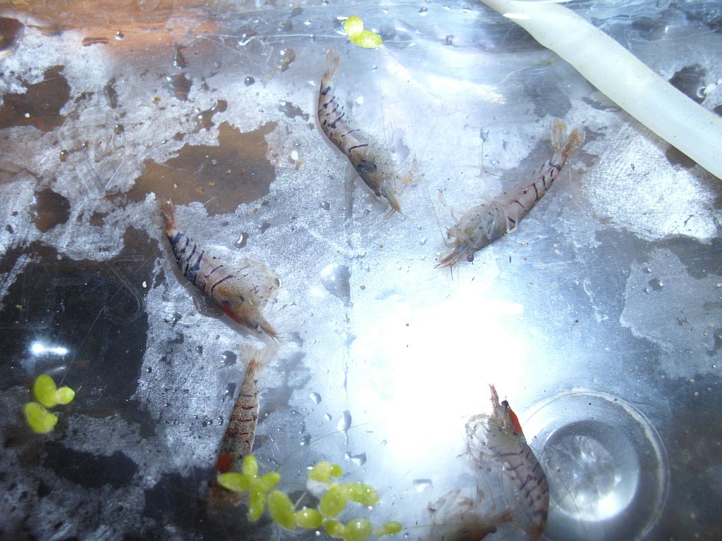 Ich habe sie in der Tüte genau beobachtet, alles ok. Die Tüte habe ich wie immer in ein kleines Plexiglasbecken umgeschüttet. Da kommen nur Garnelen oder Schnecken rein zum Eingewöhnen oder Transport. Die Garnelen paddelten munter rum.