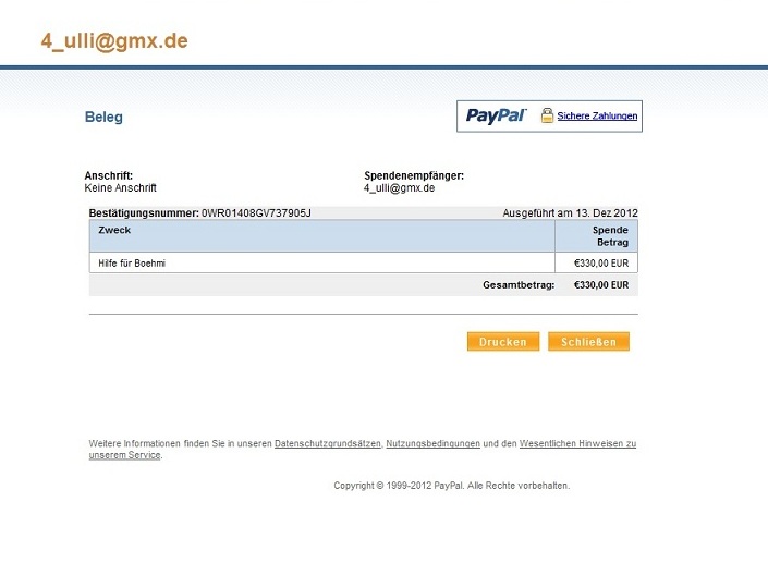 Ich versichere euch aber, dass da jeder Cent an Böhmi weitergeleitet wird - die PayPal-Gebühren, die für die Spenden fällig werden, übernehme ich. Es kommt also der volle gespendete Betrag beim DRK (mit Verwendungszweck ;)) an.