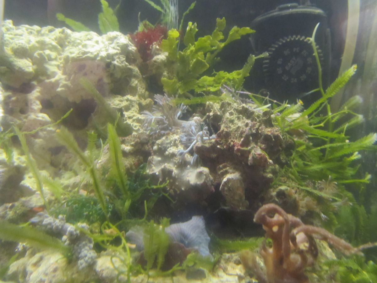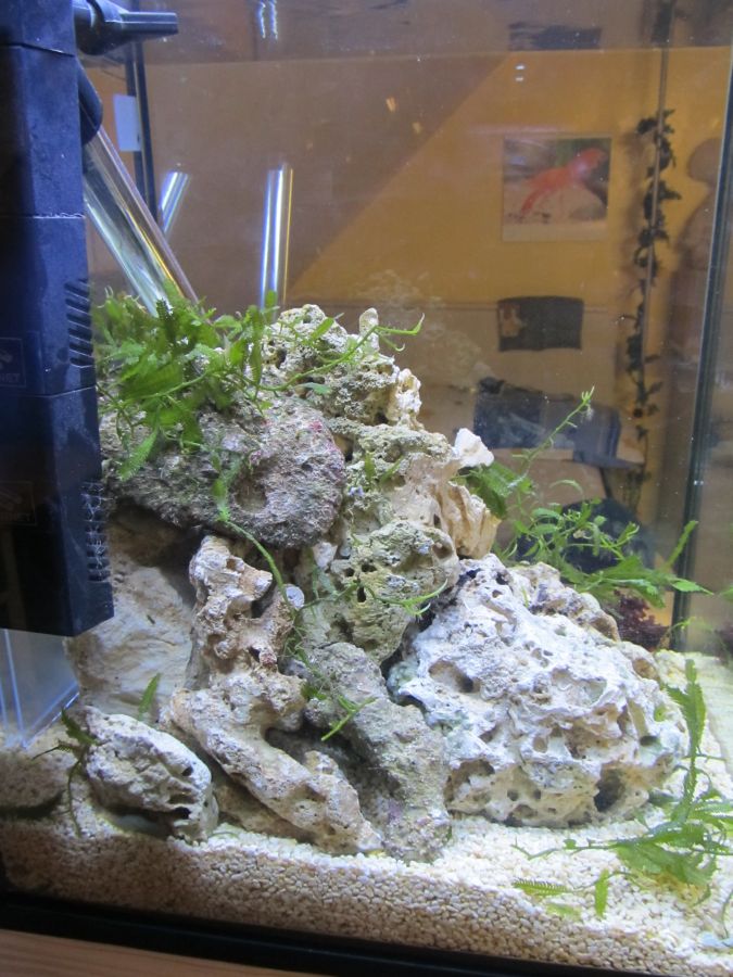 Begonnen hat es für mich aber erst mit den 2 kg LS, die ich abends am 29.12.2012 in das Becken setzte. Dabei lernte ich gleich, das die salzige Aquaristik ungleich teurer ist als Süsswasser-Aquaristik. Noch ein paar Brocken Totgestein, ein Heizer und einen Luftheber angeschlossen und los ging es.