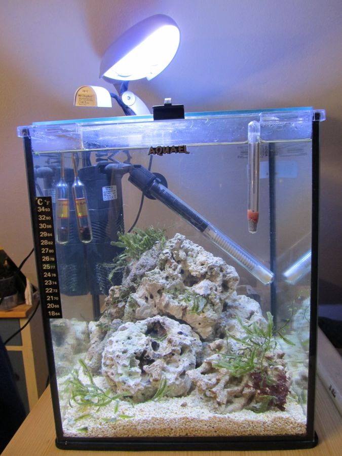 Ein paar Meerwasser-Dokus und tolle Fotos von MW-Nanos weiter war ich dann nicht mehr zu halten. Ich hatte ein 20l Dennerle Cube frei und der Platz neben den Nanobecken mit den Zwerggarnelen war frei, also los. Bisschen Salz hatte ich schon, Korallenkies war schnell besorgt.