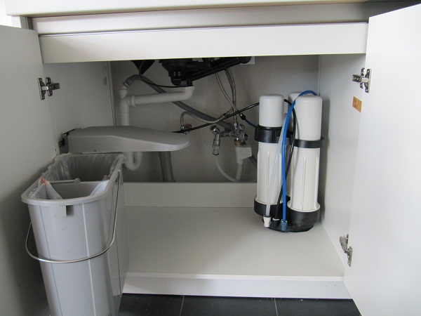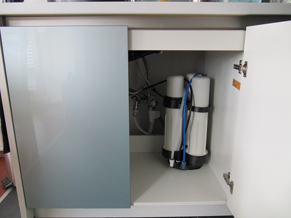 Nachdem mein Mann mit Hilfe eines weiteren Eckventils die Wasserzuleitung für den normalen Brauchwasseranschluss, die Spülmaschine und die Osmoseanlage gesplittet hat, war der weitere Aufbau sehr unproblematisch. Den Nachfilter haben wir allerdings nicht eingebaut, weil uns das nicht unbedingt als nötig erschien und der Verkäufer der Anlage auch gesagt hat, dass man ihn problemlos weglassen kann. Die Anlage haben wir unter unserer Spüle verbaut, weil wir das Osmosewasser nicht nur für die Aquaristik, sondern auch zur Herstellung von selbstgemachter Sojamilch und Sprudelwasser verwenden wollen.