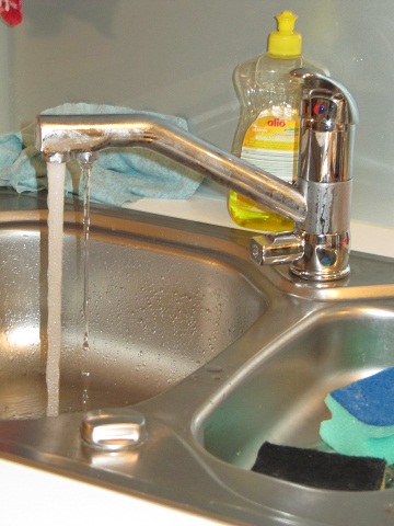 Der Clou: wir können zeitgleich Osmosewasser (hinterer Strahl) und "normales" warmes oder kaltes Brauchwasser (dickerer Wasserstrahl) entnehmen: